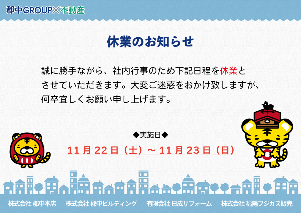 2025年11月22日(土)~11月23日(日)休業のお知らせ